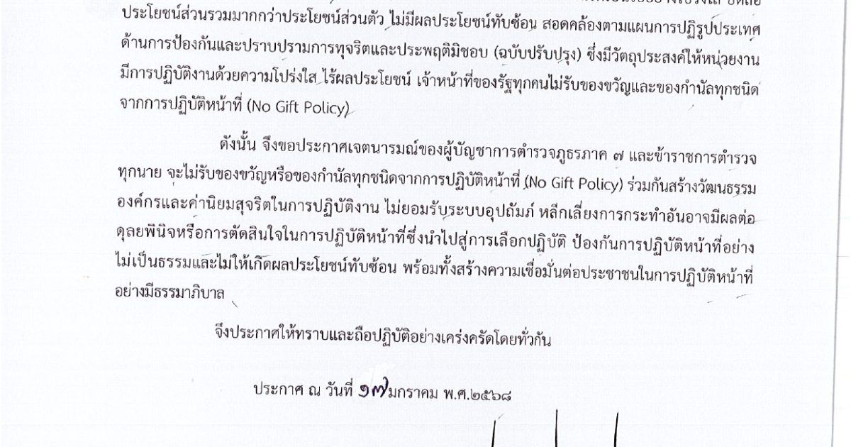ประกาศ เจตนารมณ์ที่จะไม่รับของขวัญและของกำนัลทุกทุกชนิดจากการปฏิบัติหน้าที่ (No Gift Policy)