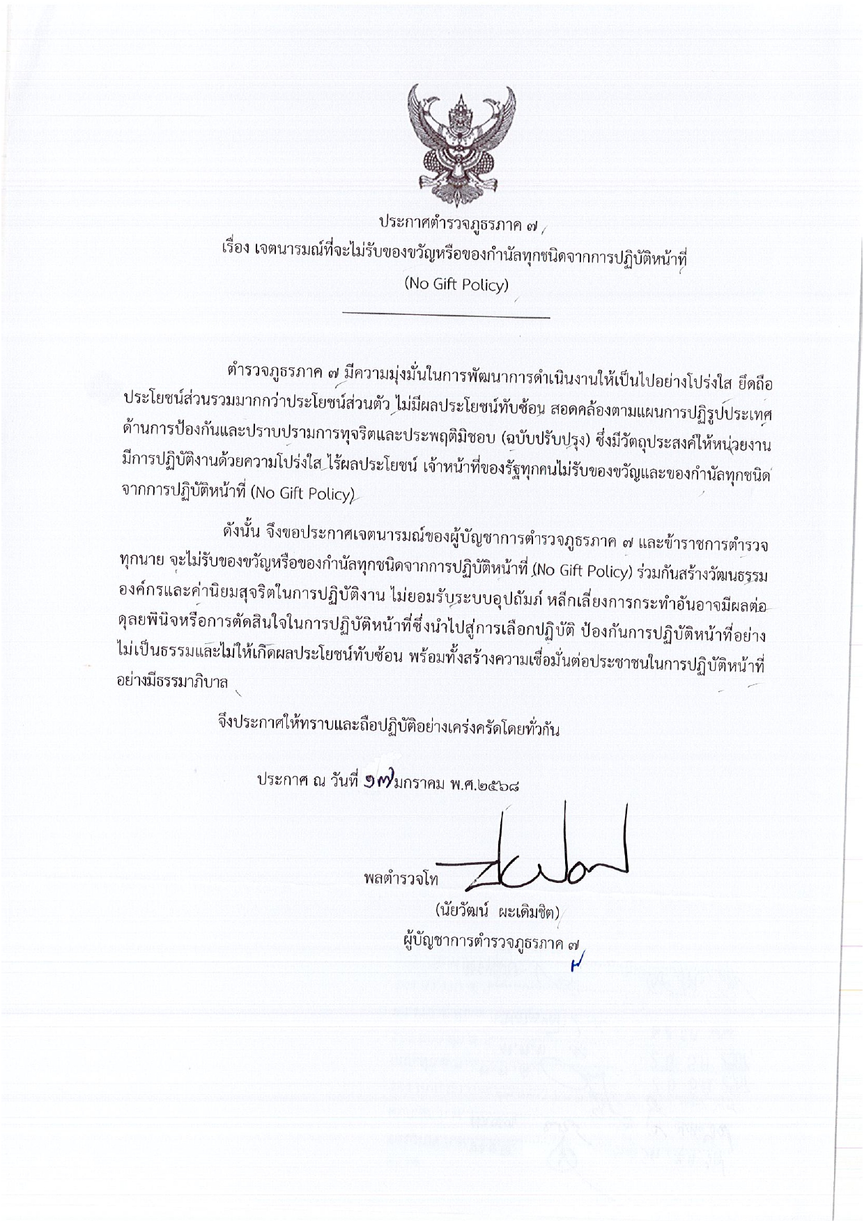 ประกาศ ตำรวจภูธรภาค 7 เจตนารมณ์ที่จะไม่รับของขวัญและของกำนัลทุกทุกชนิดจากการปฏิบัติหน้าที่ (No Gift