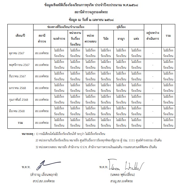 ข้อมูลเชิงสถิติเรื่องร้องเรียนการทุจริต ประจำปีงบประมาณ พ.ศ. 2568